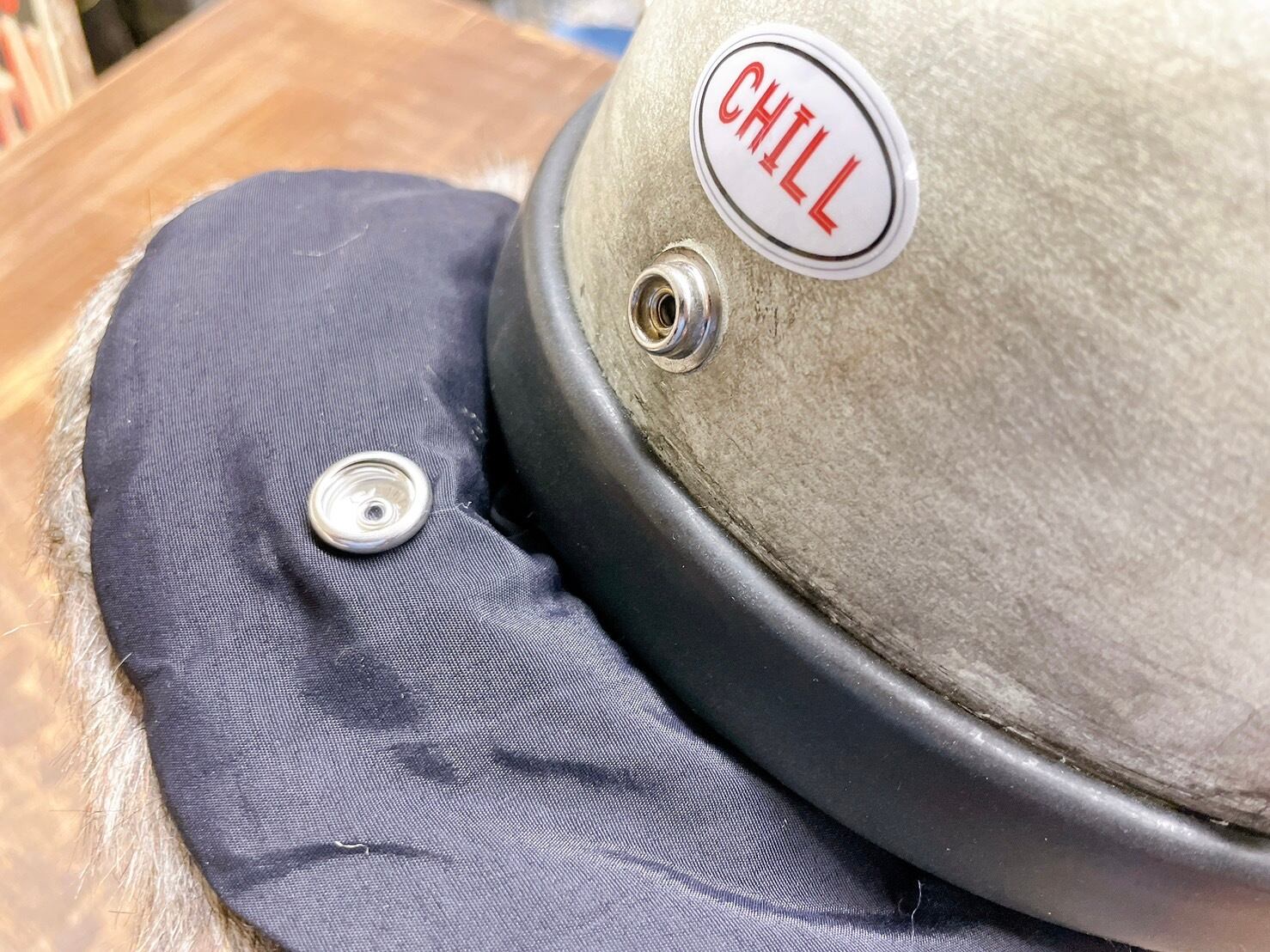ツバの外側にはボタンが付いてますので、きちんと固定でき、画像のようにハーフヘルメットと併せて被るのがオススメです。