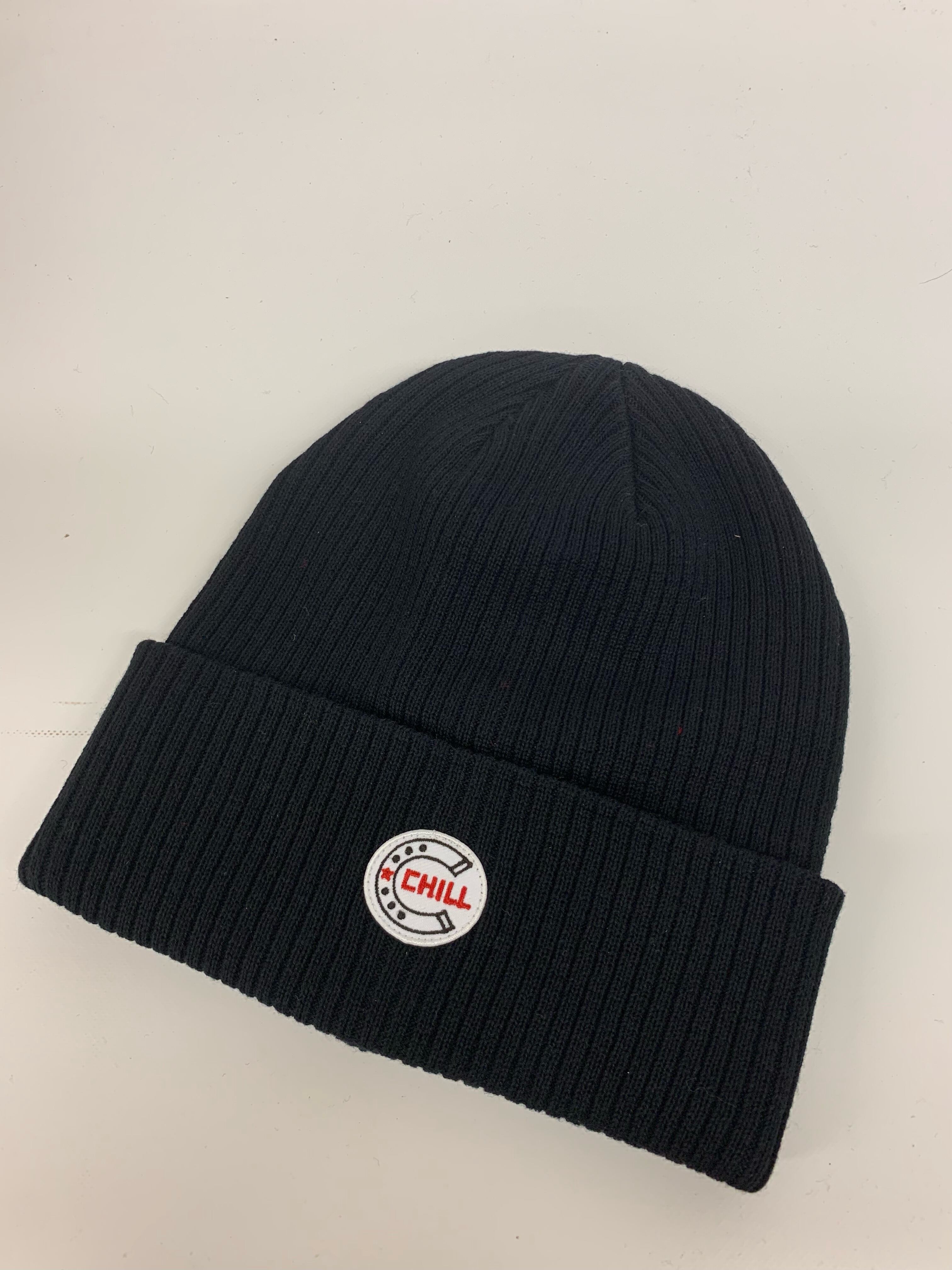 CHILLのアイコン馬蹄ロゴの丸ワッペンが付いたコットン100%のニットキャップです。