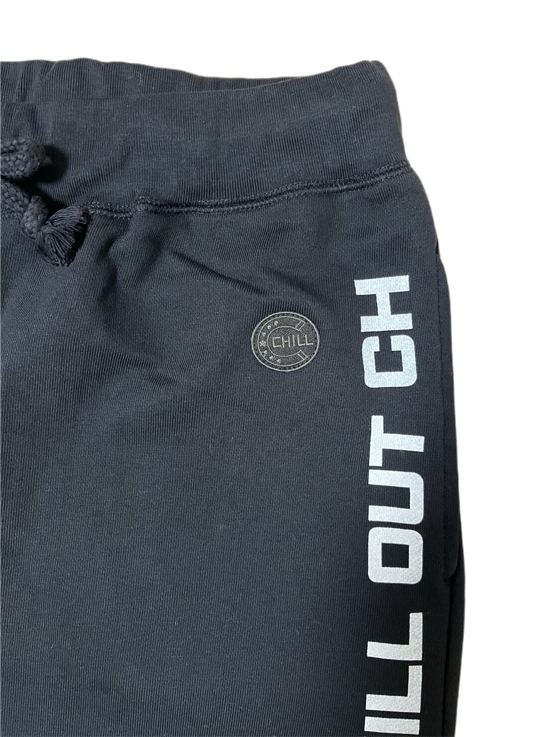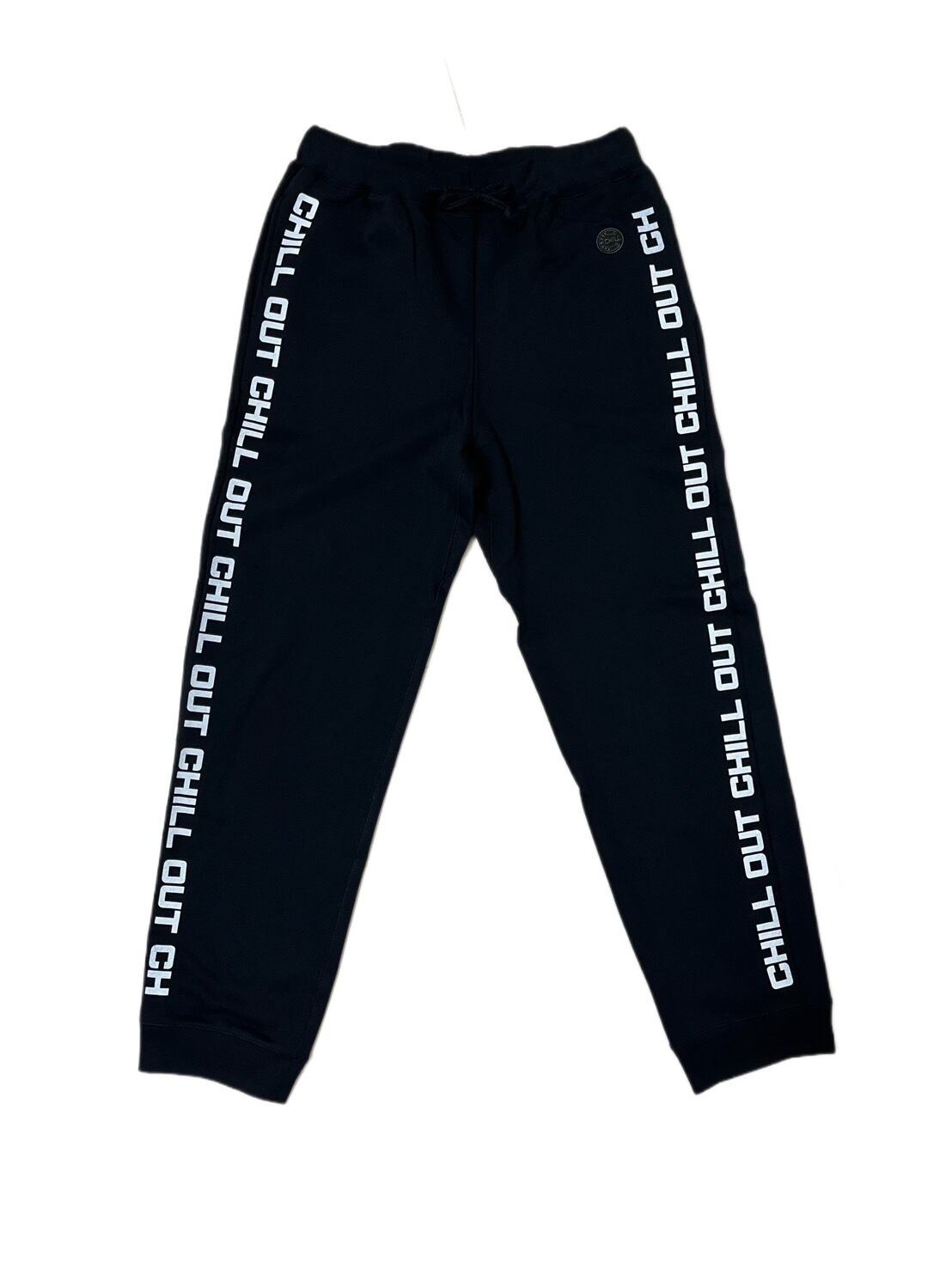 左ポケット前面にアイコンのCHILL馬蹄ワッペンを付け、左足首から上に右足首までぐるっと一周するようにCHILL OUTの文字をプリントしました。