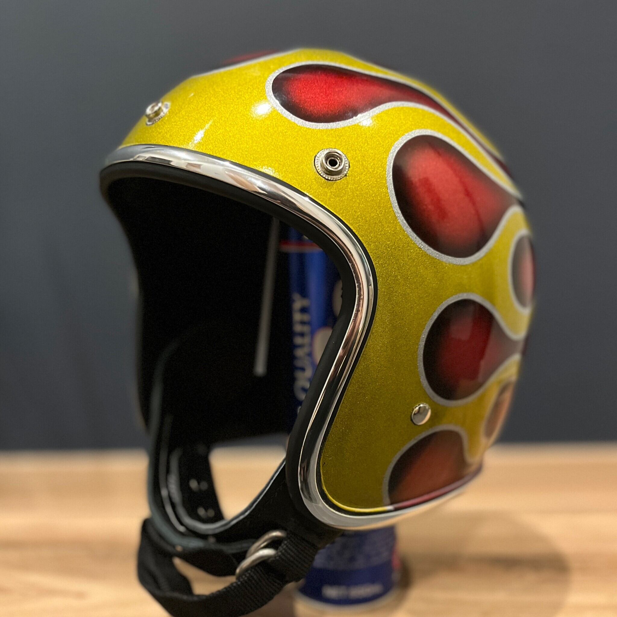 ヴィンテージのジェットヘルメットを元に帽体をより小さく、深く、よりスタイリッシュに被れるよう、顎先にかけてシェイプし、CHILLなりのアレンジを加えたクラシックヘルメットにビンテージヘルメットをイメージし、長年使い込んだヤレ感を演出。