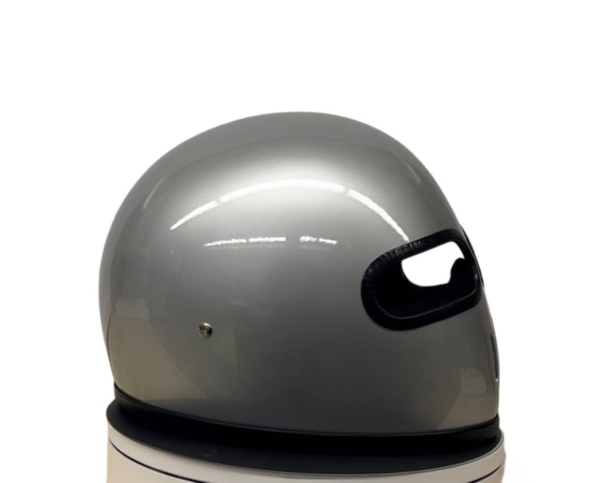 極小のシェル形状ですのでヘルメットの入口付近を絞っています。ストラップを両手で持って顔面に押し付けるようにしながら後頭部へスライドするように被るとスムーズに被ることができます。